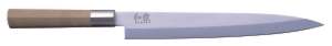 Shun professional cooking knives are made of newly developed rustfree Damascene steel - 32 layers each-, the inner part is made of Hitachi V-Gold Steel.This steel is extremely corrosion-resistant, very hard (62 % HRC, 1,0 % hydrocarbon, 1,5% cobalt) and this gives the blade its longlasting sharpness. The handle is made of fine Pakka-wood and ergonomical designed. The handle’s cross-section shows the traditional japanese “chestnut-form”, which lies comfortable in the hand.